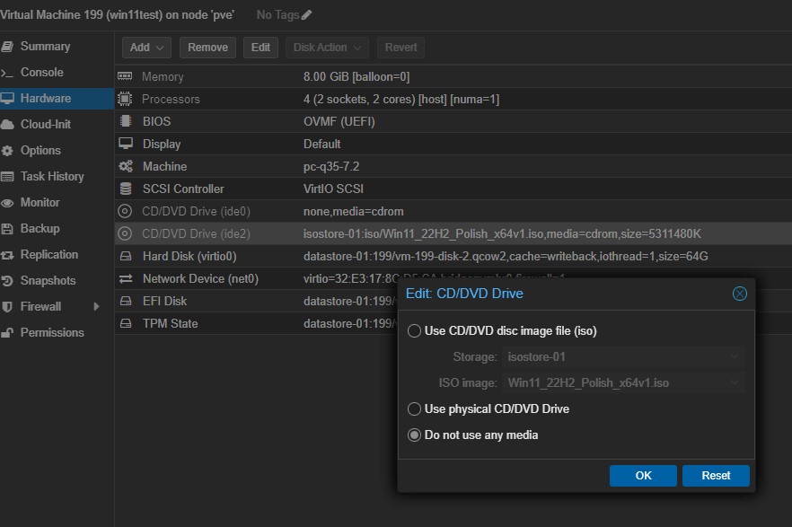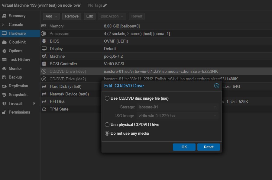Odłączenie obrazów płyt ISO od maszyny wirtualnej Windows 11 Proxmox VE
