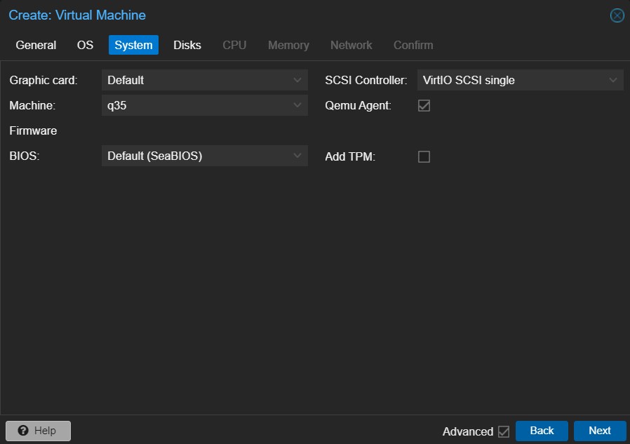 • wskazujemy typy Machine na Q35 i zaznaczamy Qemu Agent