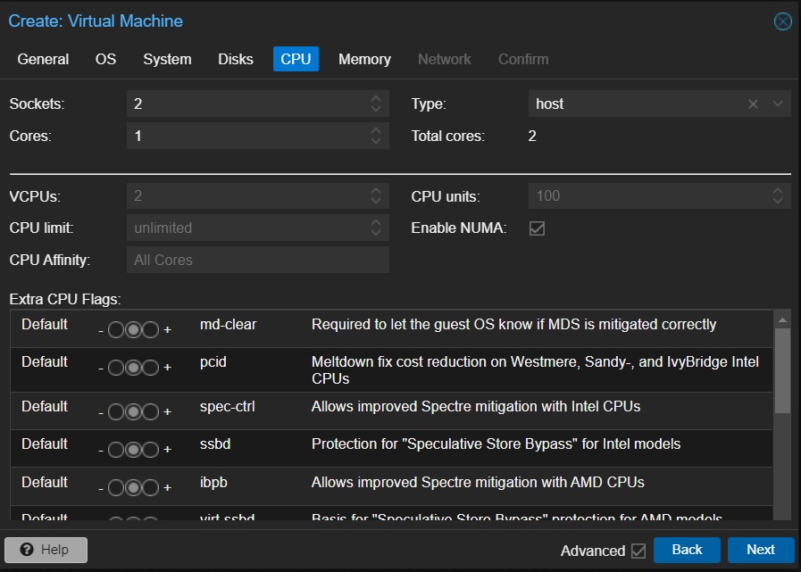 • ustawiamy 2 sockets i 1 cores, type: host i zaznaczamy Enable NUMA
