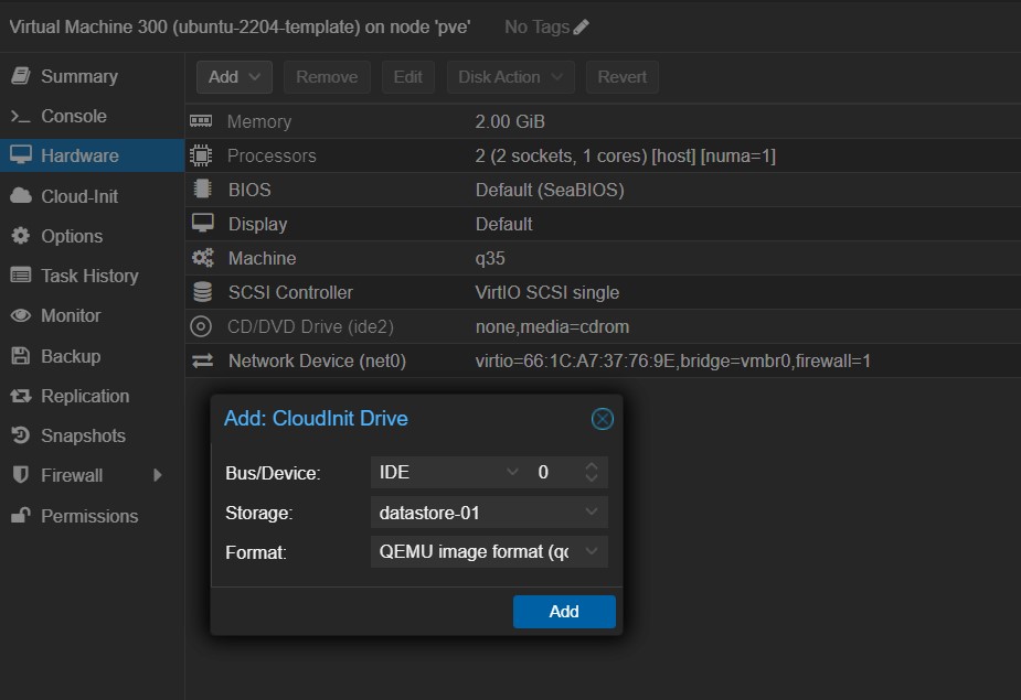 • dodajemy CloudInit Drive do zakładki Hardware naszej maszyny w formacie qcow2
