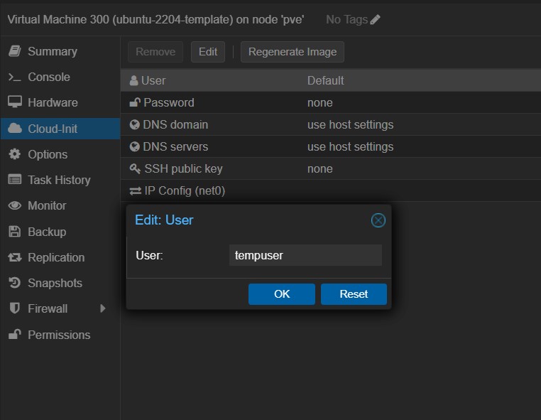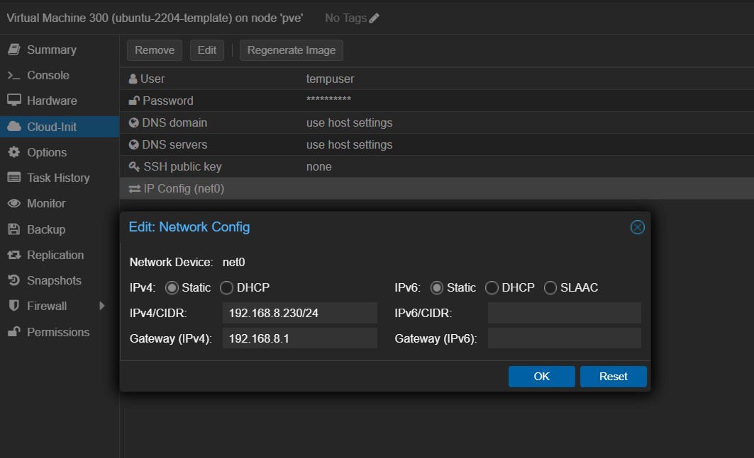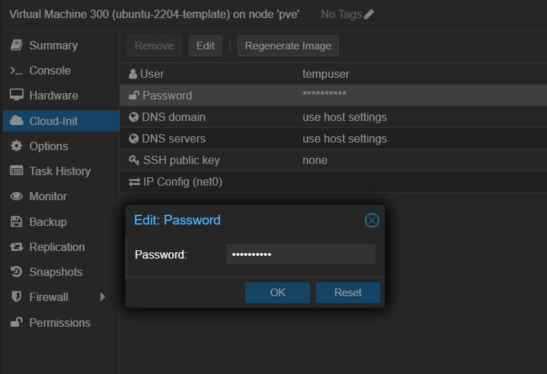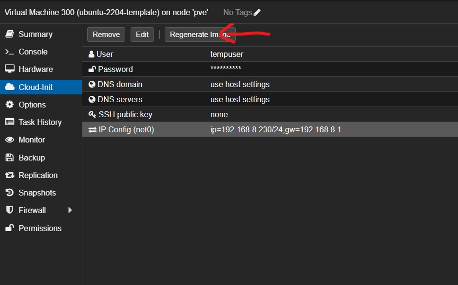 qm set 300 --sshkey ~/.ssh/authorized_keys --ipconfig0 ip=dhcp --ciuser linusr --cipassword 1234abcd.