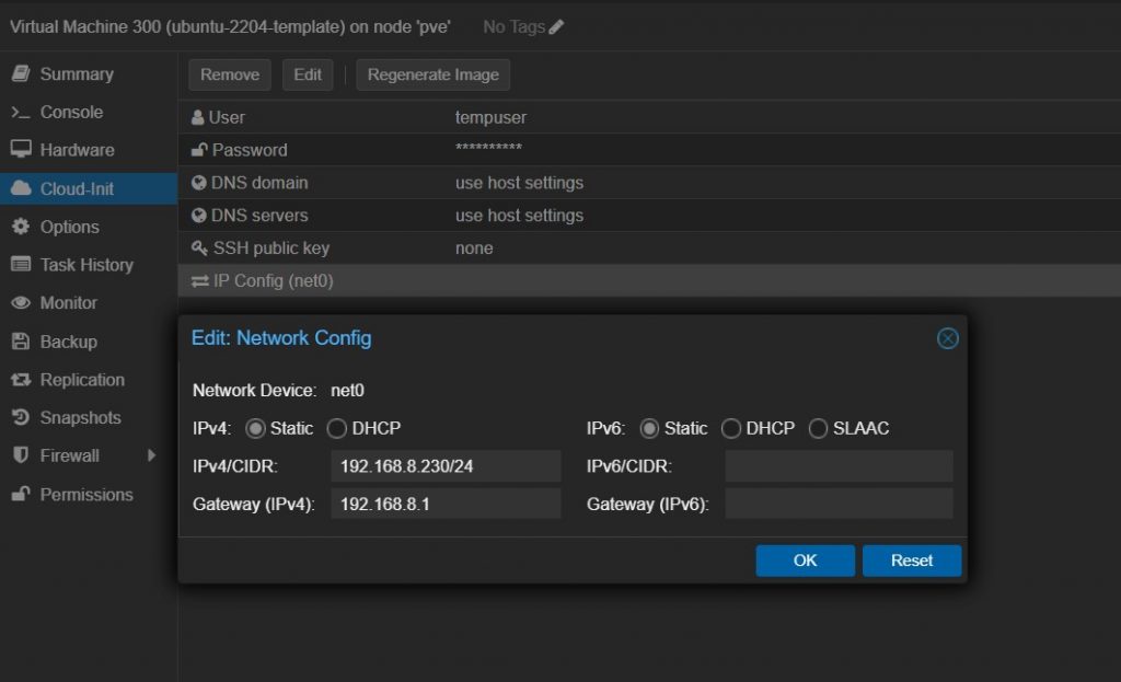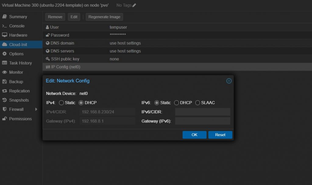 • w zakładce Cloud-Init  IP Config ustawiamy wg. uznania DHCP albo static