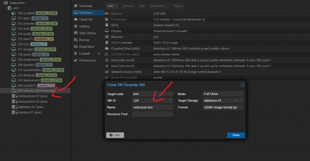 Na wybranym szablonie z menu podręcznego wskazujemy opcję Clone i podajemy nową nazwę, id , wskazujemy Target storage  i format dysku (najlepiej qcow2) dla nowej maszyny tworzonej na podstawie szablonu.