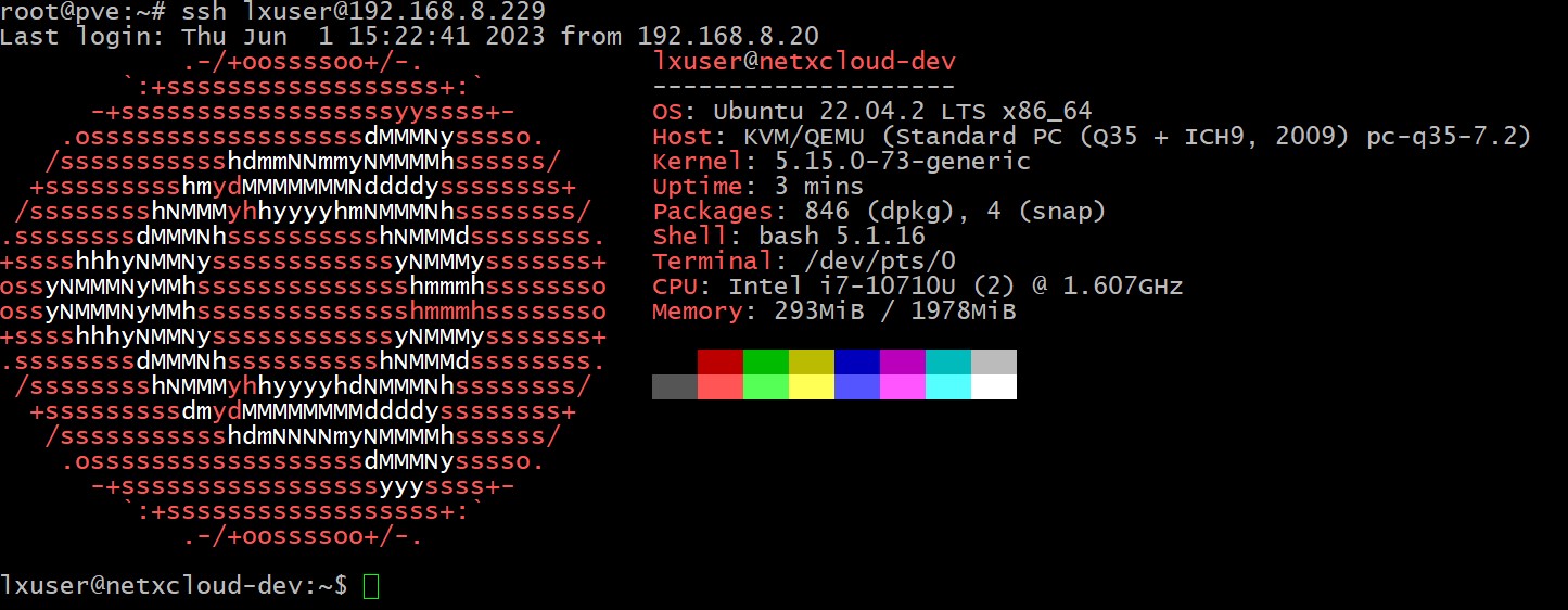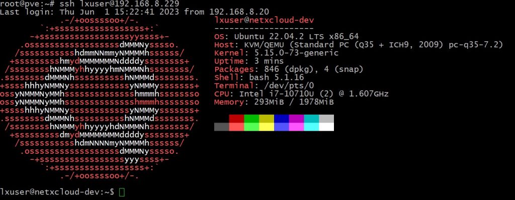 Sprawdzamy czy możemy się zalogować do maszyny wirtualnej zarówno przez klucz publiczny (np. z konsoli Proxmox) jak i hasłem (z innego serwera Linux)