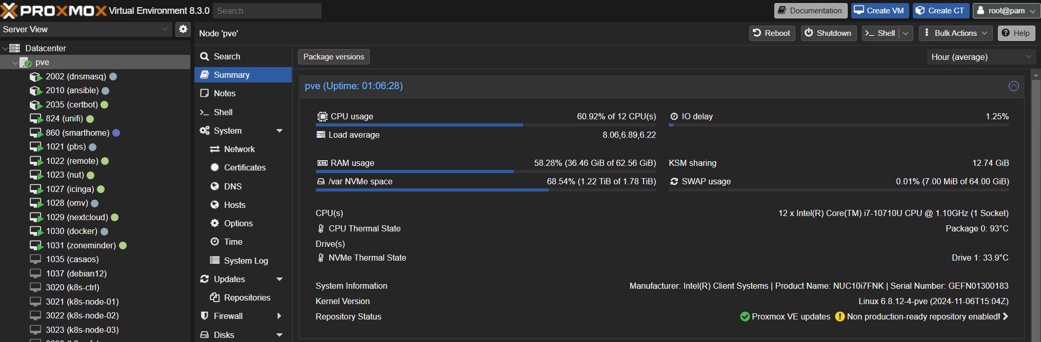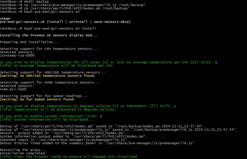 Większość informacji takich jak temperatura CPU/Dysku czy informacje systemowe można łatwo dostosować używając skryptu PVE-mods.