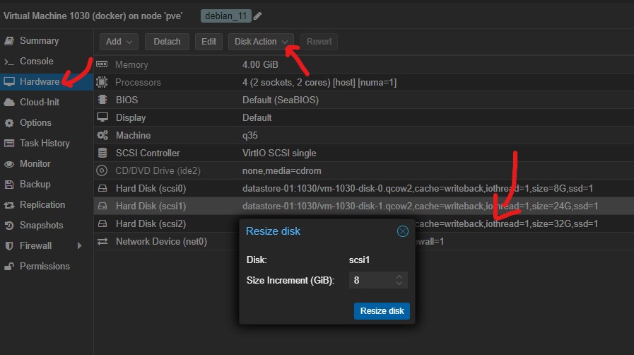 Na wyłączonej maszynie wirtualnej w konsoli Proxmox zwiększamy wybrany dysk np. o 8 GB