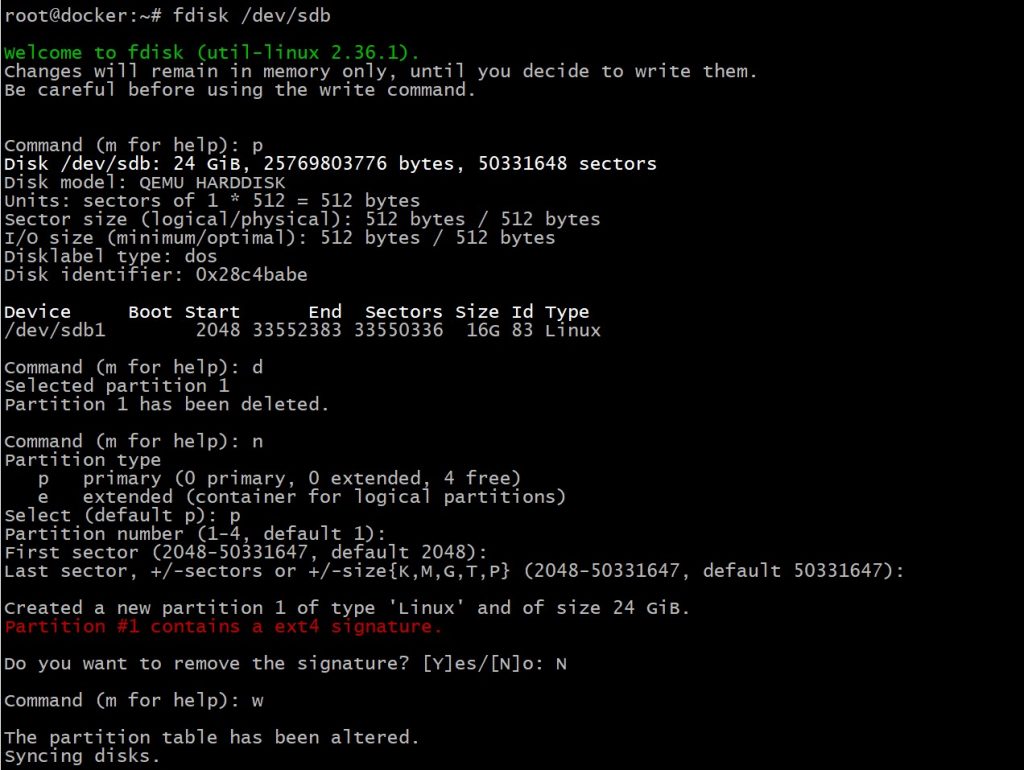 Po uruchomieniu maszyny wirtualnej z konsoli. Należy pamiętać aby nie usuwać istniejącej sygnatury dysku podczas zapisu zmian w programie fdisk.